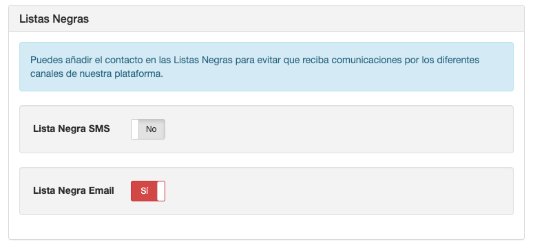 Cuando se añade un contacto a una Lista Negra, el contacto no recibirá más comunicaciones de ese tipo.