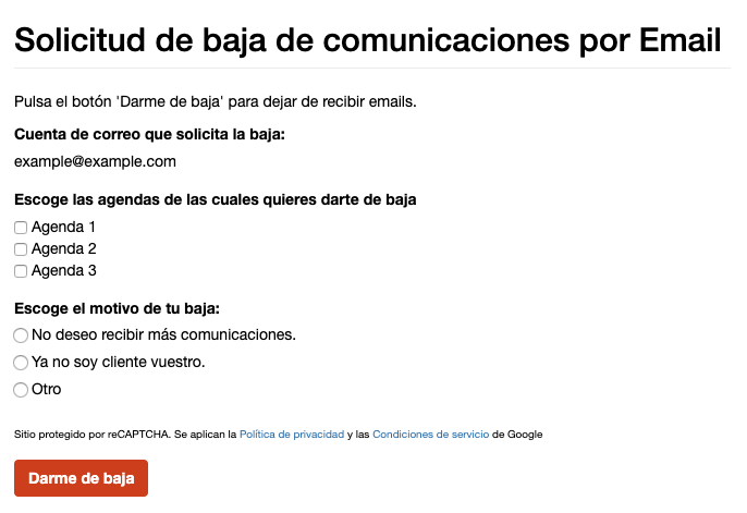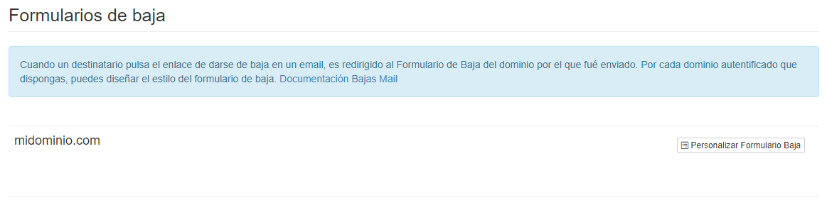 Cuando un destinatario pulsa el enlace para darse de baja en un email, este es redirigido al Formulario de Baja del dominio por el que fue enviado.