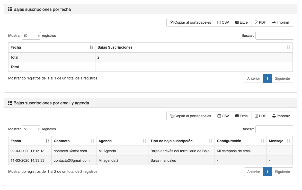 - Un listado con la fecha y el contacto que se dio de baja. Dependiendo del origen de la baja, podrás obtener desde que envío se produjo.