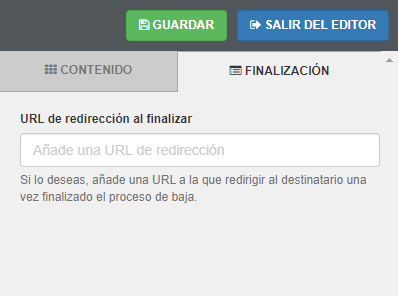 - En el apartado de finalización podrás añadir una URL para redirigir al usuario una vez finalice el proceso de baja.