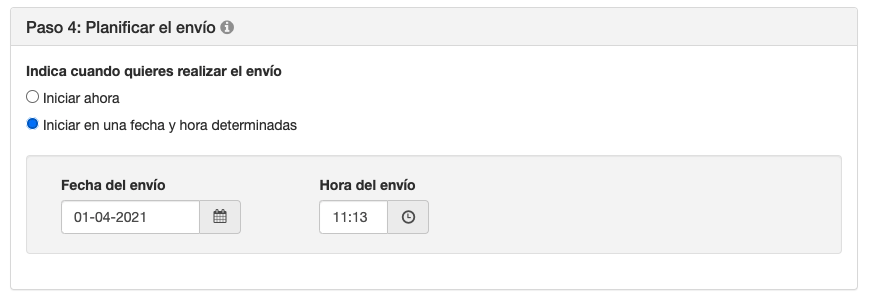 En este paso, elegiremos cuando queremos realizar el envío. Puedes escoger enviarlo inmeditamente, o bien, escoger una fecha y hora para que puedas programar el envío.