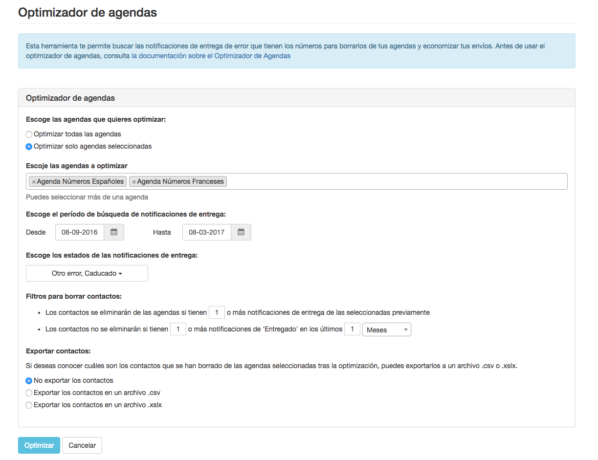 En esta captura, se eliminarán de las agendas 'Agenda Números Españoles' y 'Agenda Números Franceses' los contactos que tengan 1 o más notificaciones de entrega de “otro error” o “caducado” entre el 08-09-2016 y el 08-03-2017 y el contacto no tenga una notificación de entregado en el último mes.Escoge las agendas que quieres optimizar