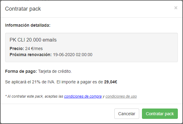 Cuando quieras contratar un pack determinado, debes pulsar en el botón 'Contratar' correspondiente a dicho pack, y te aparecerá una ventana emergente con la información detallada del pack:
