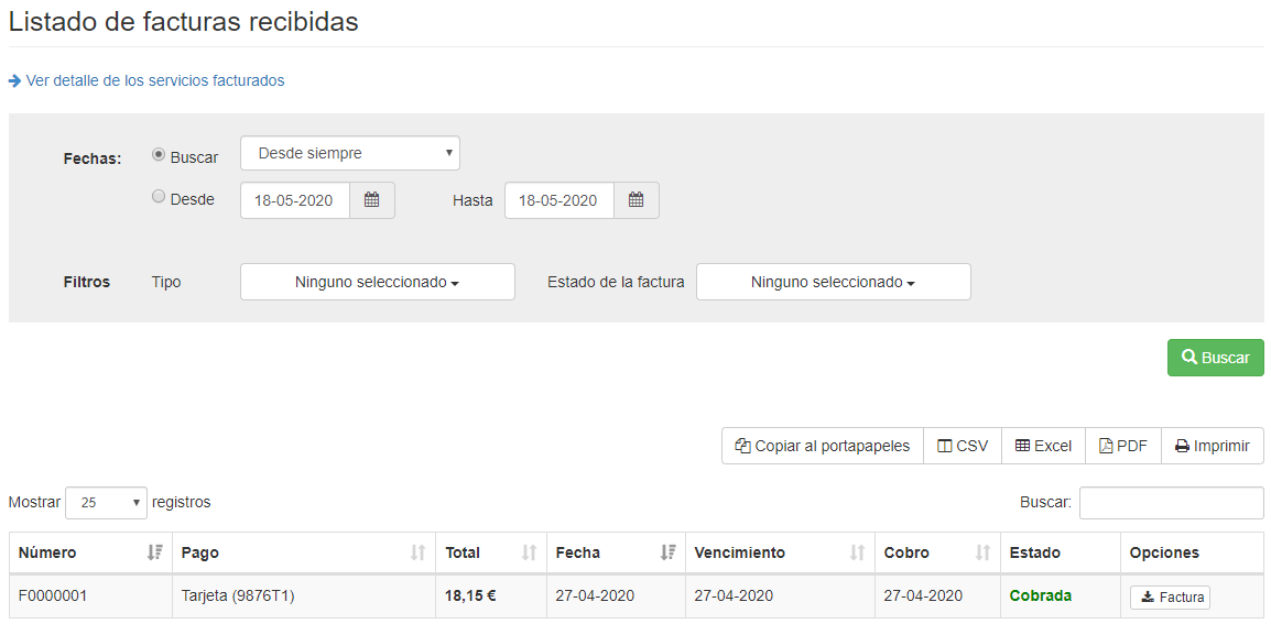 Si necesitas descargar cualquier factura de las compras que has realizado, puedes acceder al listado de facturas de tu cuenta donde podrás filtrar por fecha, tipo y estado de las mismas.
