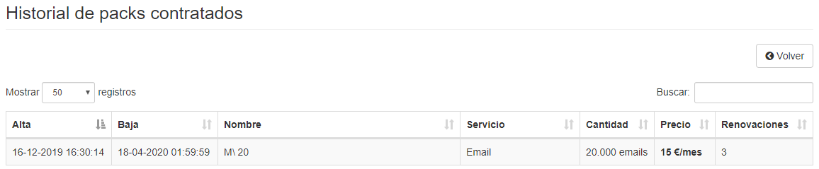En este listado podrás visualizar el historial de todos los packs que hayas contratado y ya no tengas activos en tu cuenta de cliente, mostrando la siguiente información: