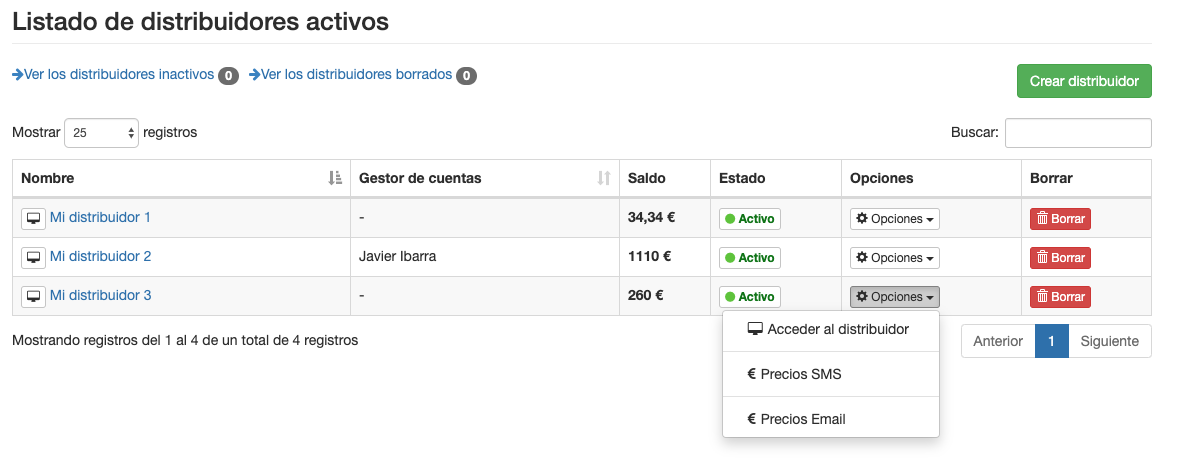 Como distribuidor, tienes la posibilidad de crear nuevos distribuidores y clientes que tu gestionarás. También podrás modificar el precio por SMS para cada país de cada ruta de envío y el precio al que cobrarás el envío de emails.